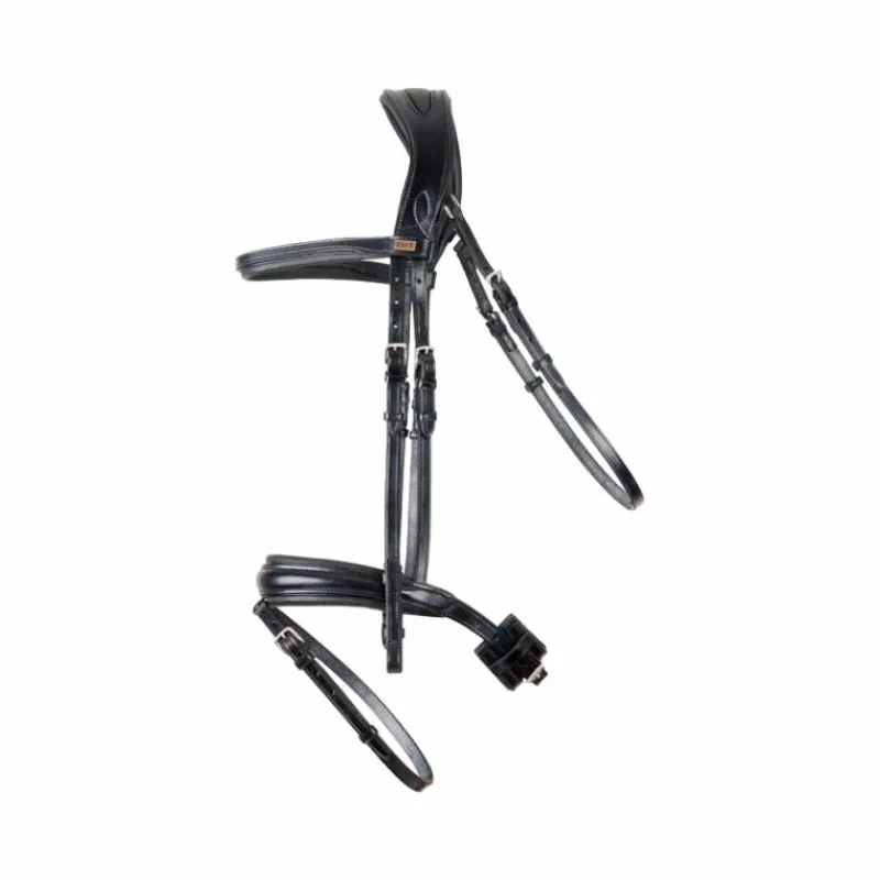 - Bridon à la têtière reculée et large afin de dégager les oreilles et répartir les pressions au niveau de la nuque