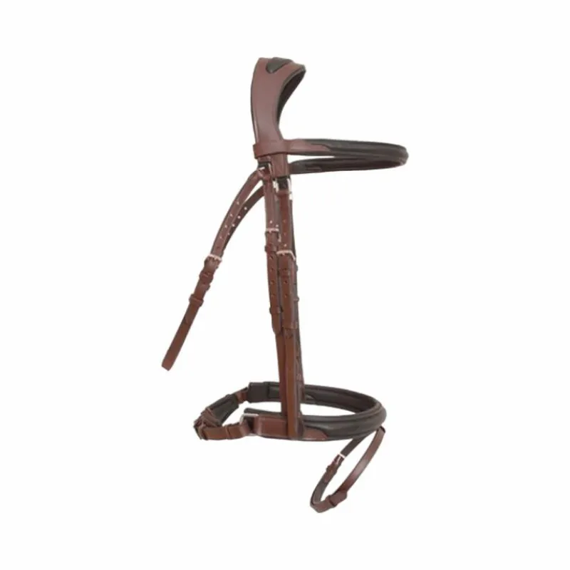 - Muserolle droite large (3cm) et frontal entièrement en cuir souple et mousse pour un contact plume et moelleux sur le cheval. Bouclerie en acier inoxydable.Livré avec des rênes caoutchouc à gros picots.