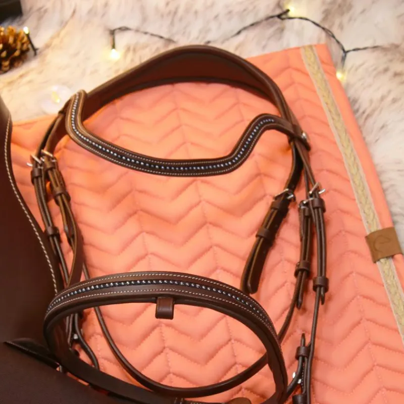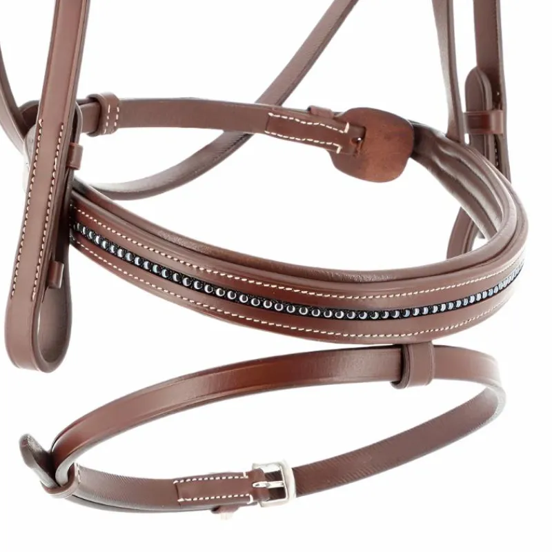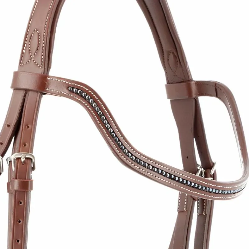 - Frontal découpé et muserolle surmontés d’une ligne de perles.