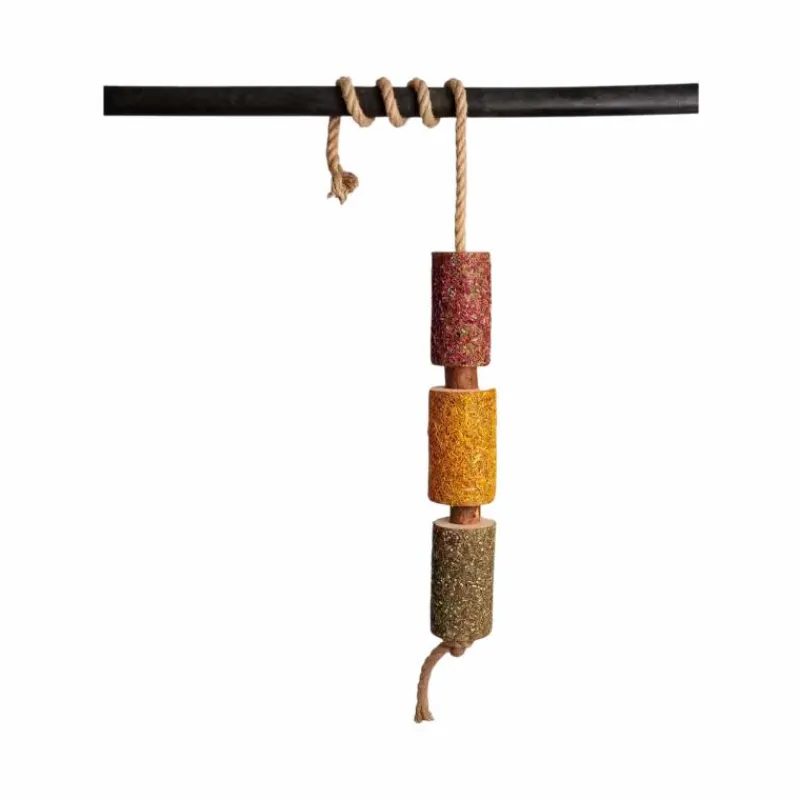 Bâtons de bouleau, bâtons de pin, persil, bleuet rouge, mélisse, calendula, huiles essentielles (lavande, eucalyptus, menthe poivrée, citron), miel, eau, corde de coton