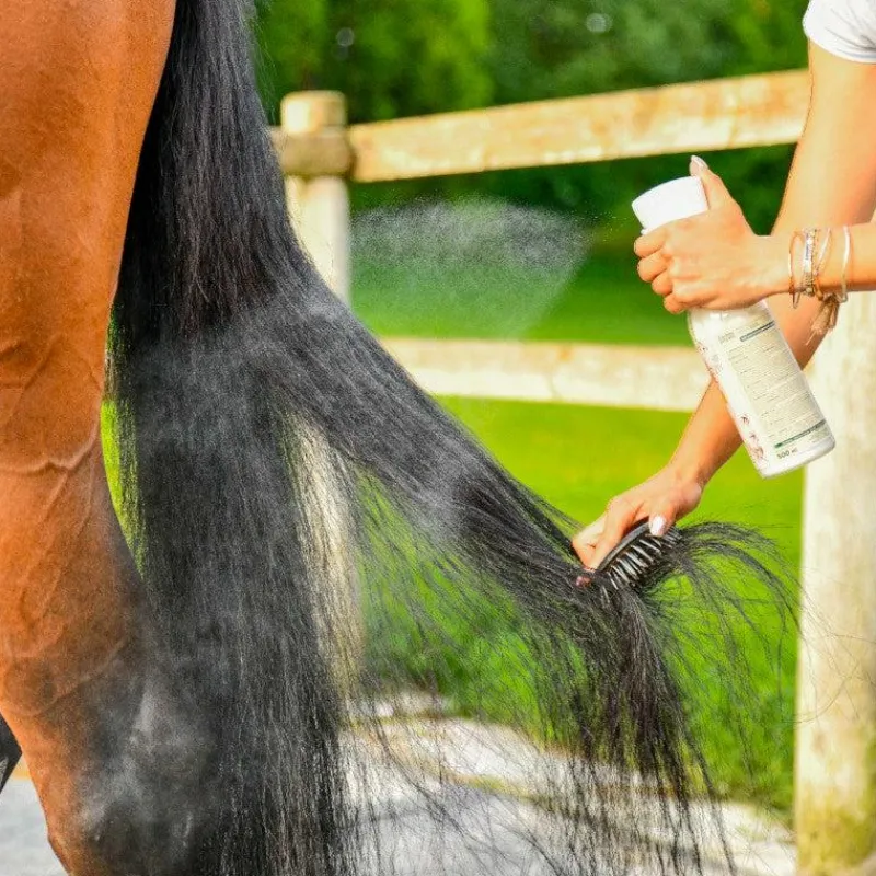 Vaporiser directement sur poil sec ou humide, puis laisser sécher avant de brosser le cheval.