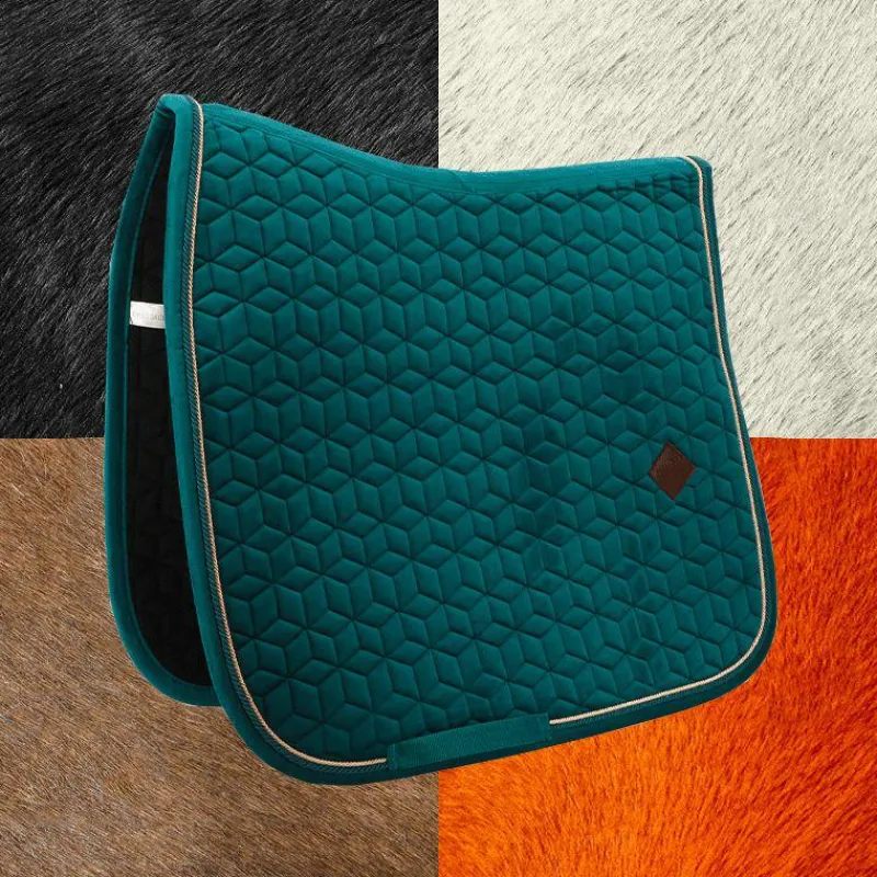 - Le tapis de dressage Velvet très élégant avec son effet velours et son passepoil à double torsion.