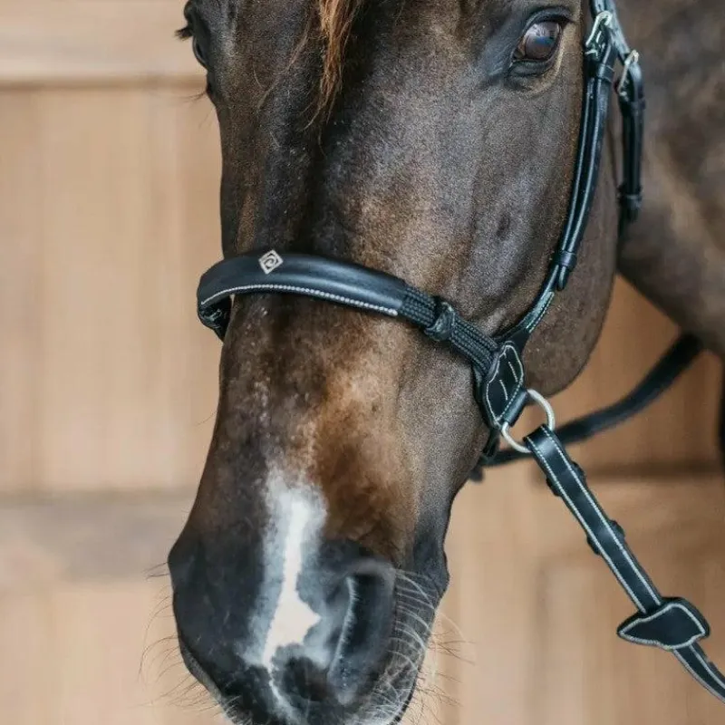 • Bridon sans mors particulièrement adaptée aux chevaux sensible au mors ou à ceux qui ont besoin d’un contact plus léger