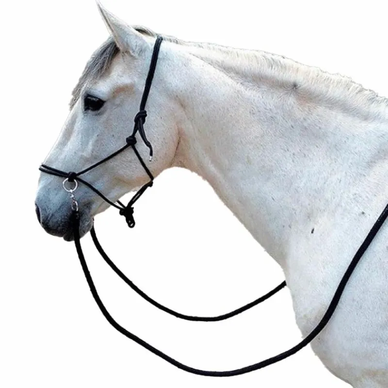 - Licol éthologique pré-noué en polypropylène équipé de 2 anneaux en acier chromé sur la muserolle pour fixer les rênes