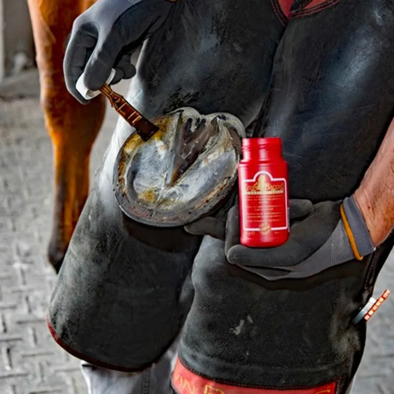 - Il est recommandé d’appliquer le Hoof Solution sur la sole et la fourchette du pied à chaque renouvellement de ferrure et avant toute pose de silicone.