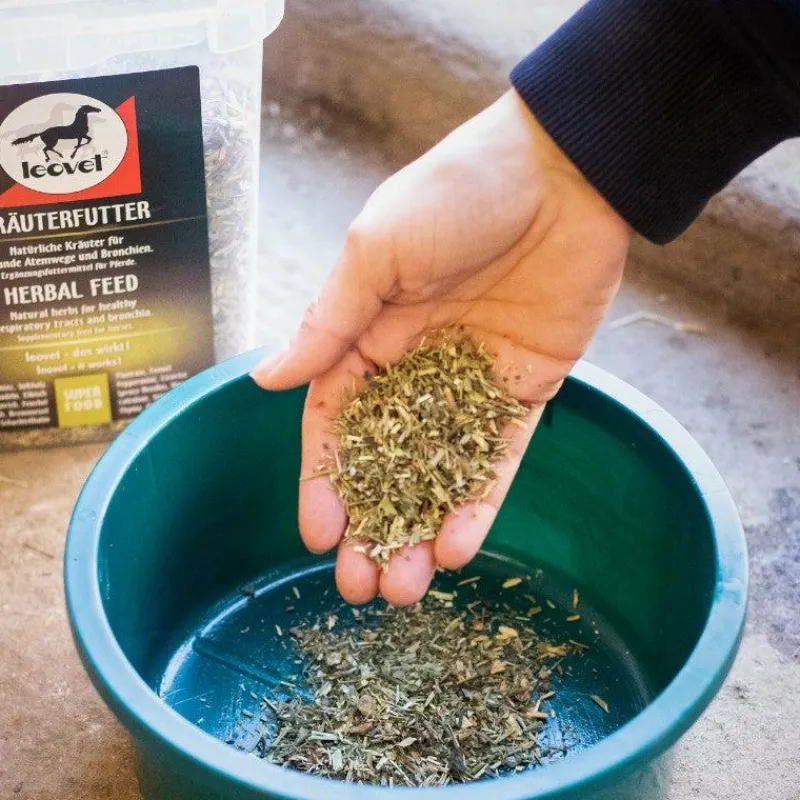 Grand cheval : 2 x par jour 2 tasses d’Aliment complémentaire aux herbes Leovet (soit environ 200 g par jour).