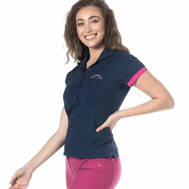 - Le polo est contrasté avec un tissu imprimé à pois
