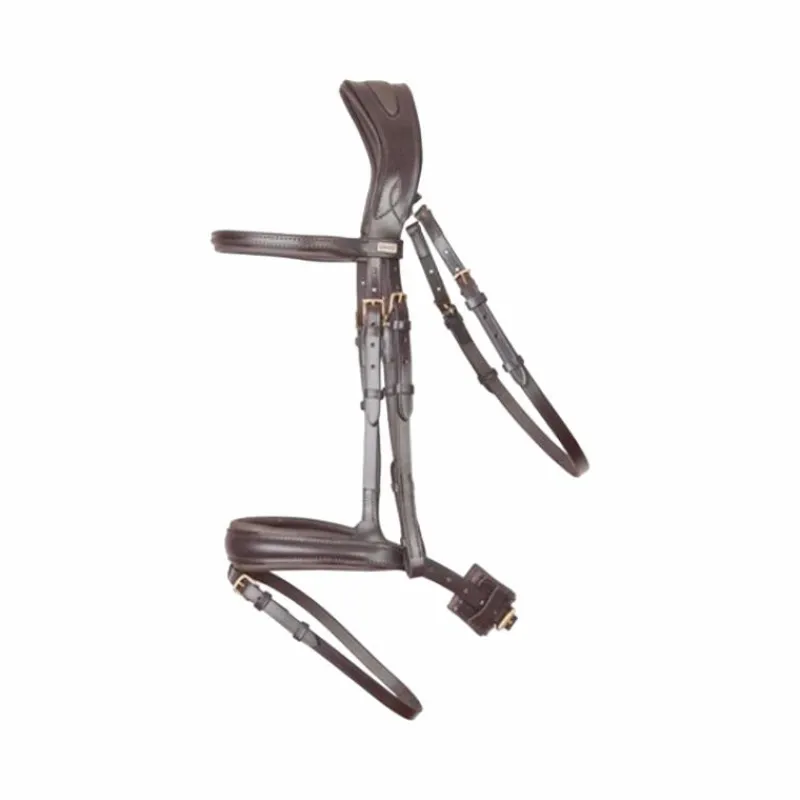 - Bridon à la têtière reculée et large afin de dégager les oreilles et répartir les pressions au niveau de la nuque