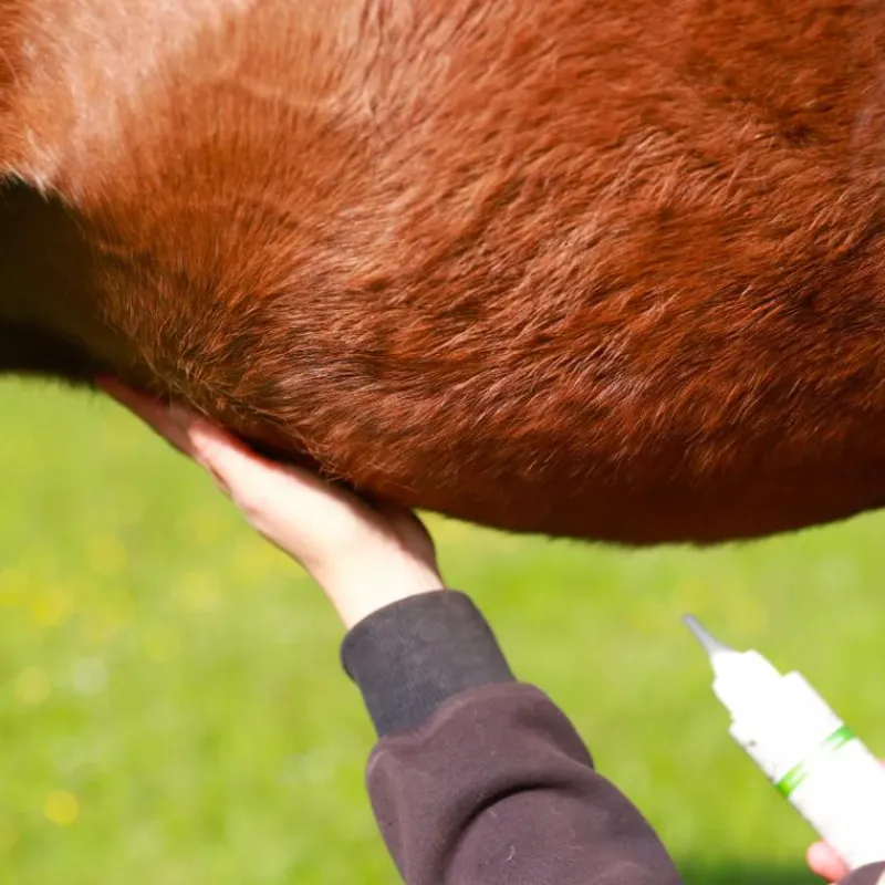 Appliquer la lotion avec vos mains au niveau de la ganache, entre les antérieurs et les cuisses ainsi qu’à l’aide de la canule dans les crins (toupet, crinière et base de la queue).