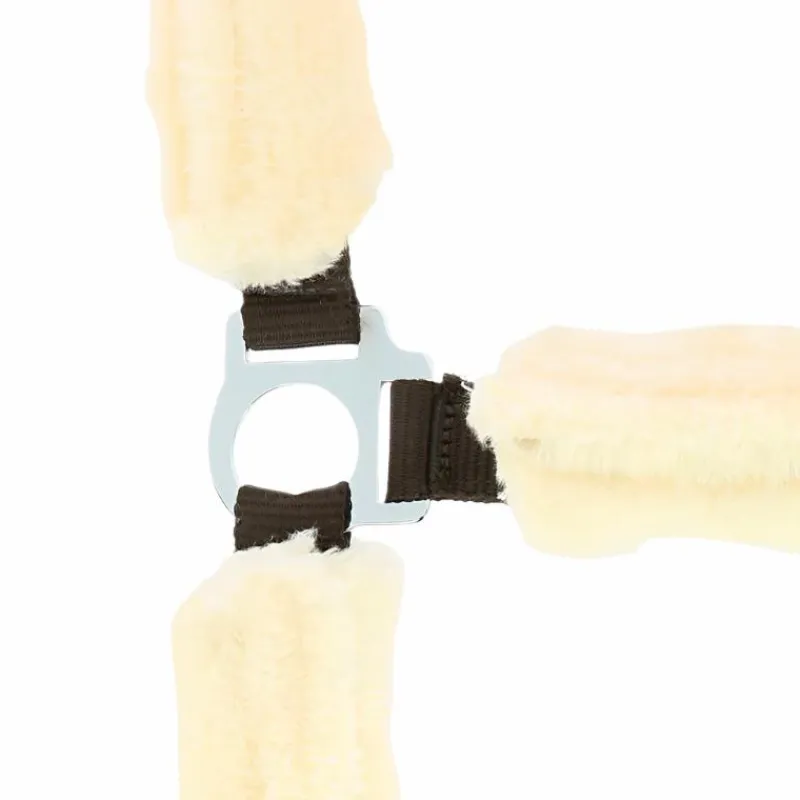 - En polypropylène avec boucle d’ajustement et mousqueton, recouvert intégralement de mouton synthétique détachable par bande auto-agrippante.