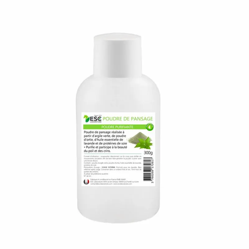 • Poudre de pansage réalisée à partir d’argile verte, de poudre d’ortie, d’huile essentielle de lavande et de protéines de soie