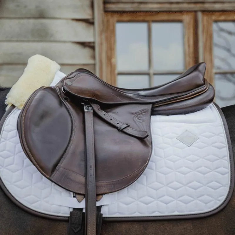 - Le logo subtil en cuir artificiel est placé dans un endroit central légèrement plus haut qui laisse toujours de la place pour la broderie de votre propre logo si vous le souhaitez. Le tapis de selle Skin Friendly est lavable en machine à 30 °, sans sèche-linge.