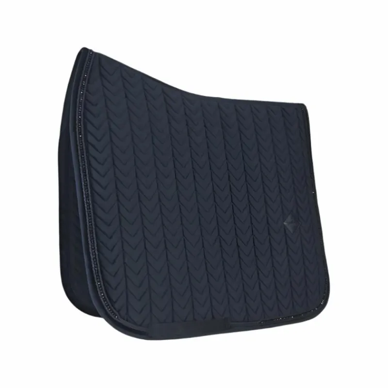 - L’extérieur du tapis de selle est fabriqué à partir de notre célèbre et doux tissu velvet surpiqué en « Fishbone ». Le passepoil est terminé par des perles très chics.