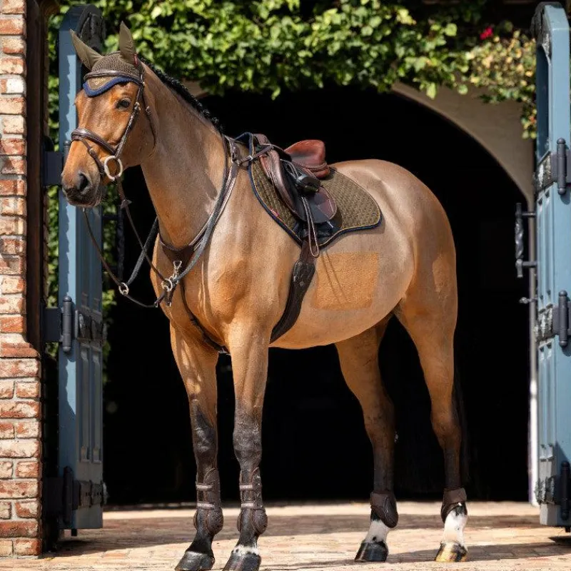 • Pattes élastiques en D pour permettre une fixation facile et antidérapante à la selle tout en laissant un espace pour accrocher les aides artificielles
