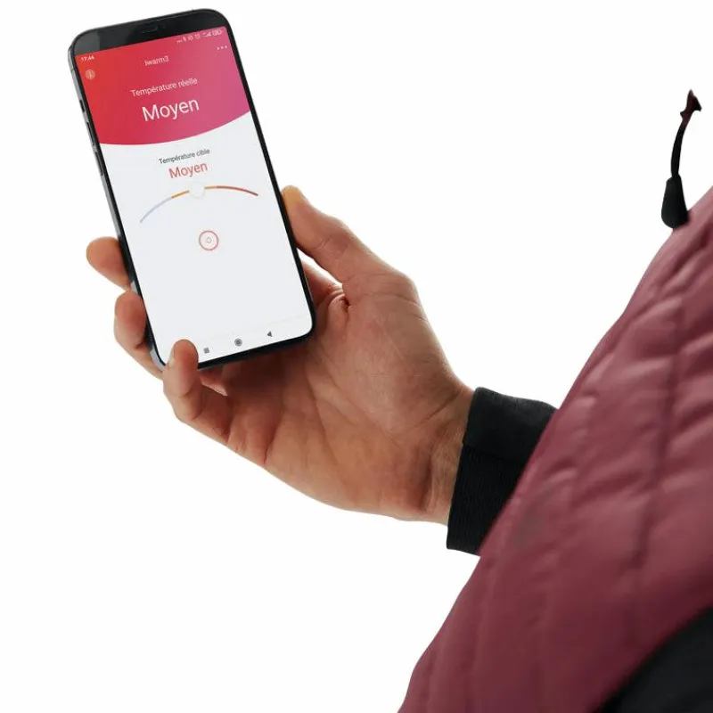 • La technologie s’active via un bouton situé sur le côté de la veste. La température se module sur le bouton ou via l’application « iwarm3 » téléchargeable sur smartphone
